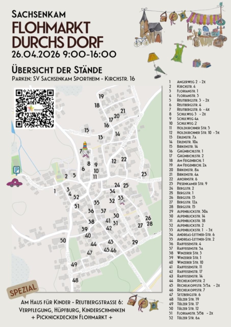 Alle Mitbürger:innen sind eingeladen, vor ihrem Haus/ihrer Wohnung einen Stand zu machen – die Besuchenden ziehen durchs Dorf von Standl zu Standl. Frei nach dem Motto: Sachsenkam kennenlernen beim Flohmarkt durchs Dorf. (Artikel im Tölzer Kurier am 16.04.2026)